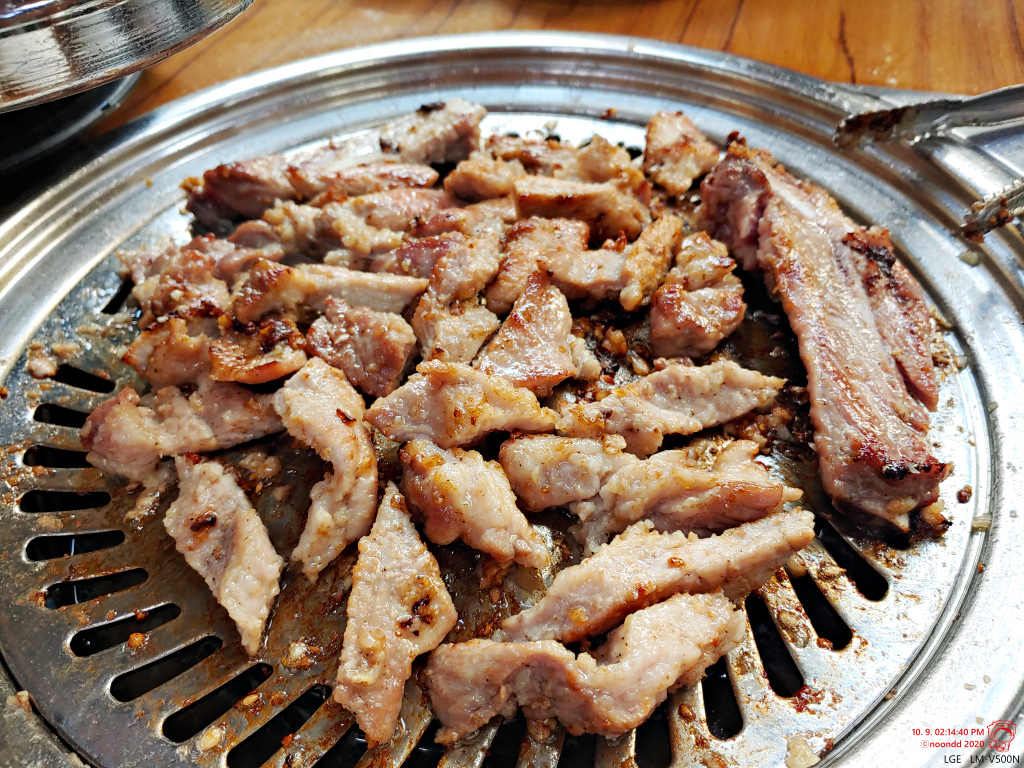 처음 왔을 때 다른 테이블들 불판 위에 구릿빛 고기들이 보이기에 간장으로 양념한 양념갈비 메뉴가 따로 있는 건 줄 알았는데, 생갈비가 익으면 그렇게 변하는 거였다. 직원 분 덕분에 다 익은 고기를 편하게 쏠랑 쏠랑 집어 먹을 수 있었다.