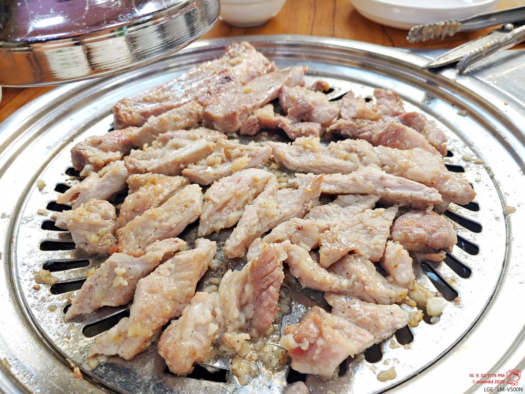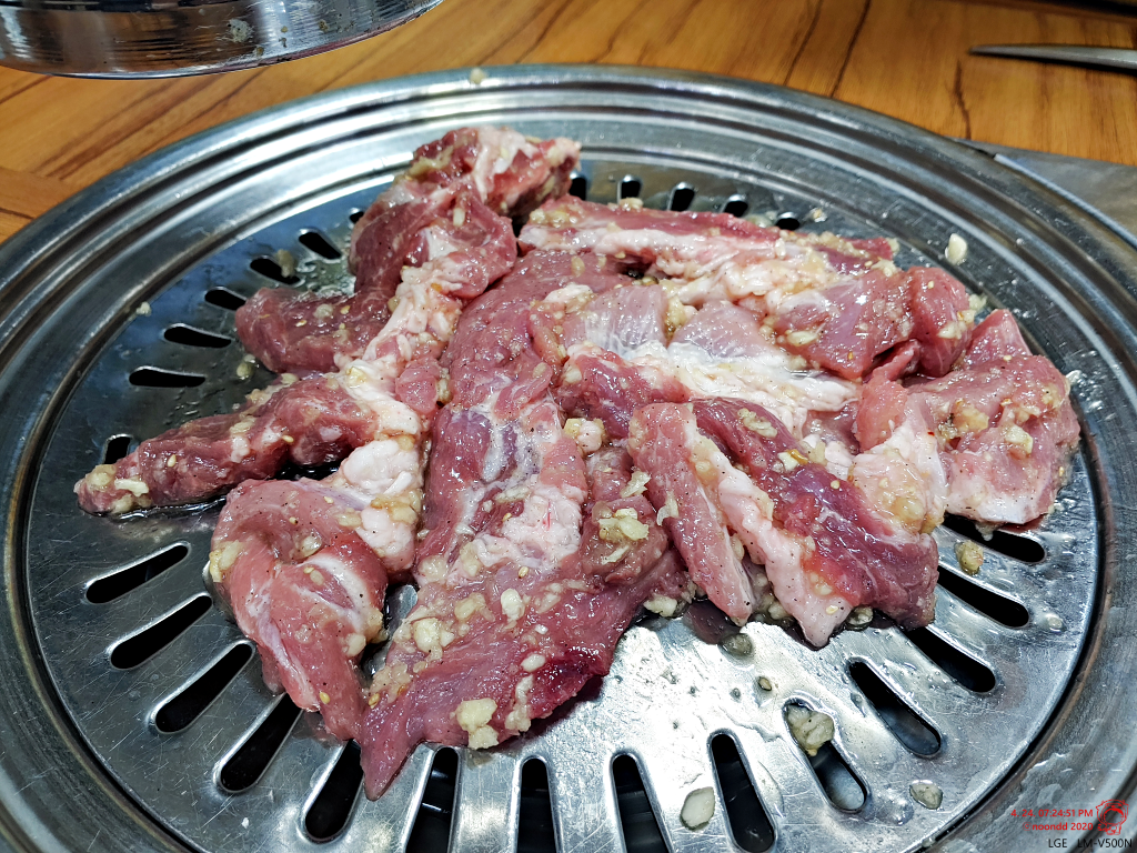 이건 처음 갔을 때 나왔던 고기. 두꺼비숯불생갈비는 양념에 마늘을 왕창 때려 넣는 게 키포인트.