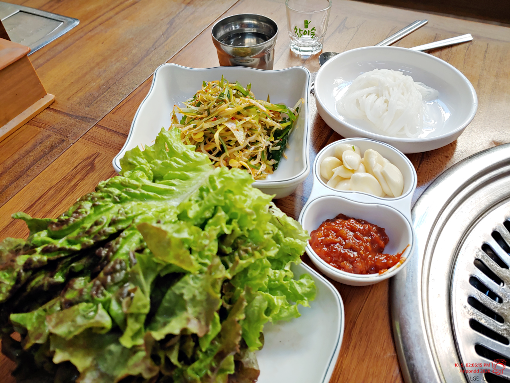 고깃집이라면 나오는 상추랑 콩나물, 마늘, 쌈장, 무, 김치 등 기본 찬이 깔린다.