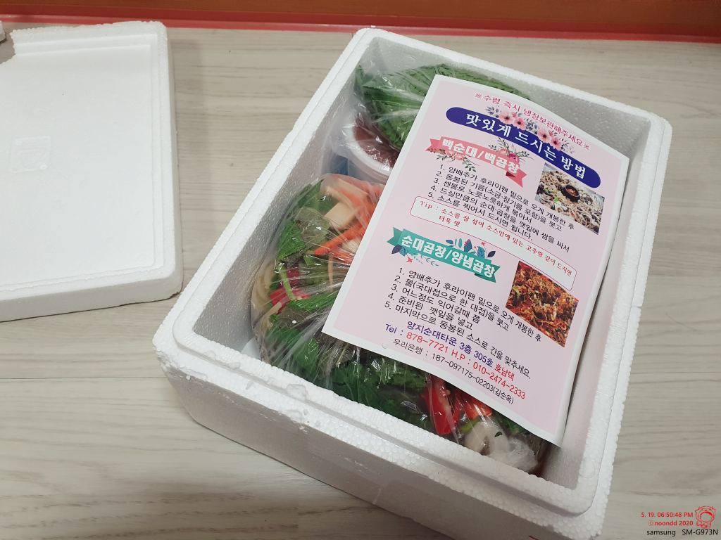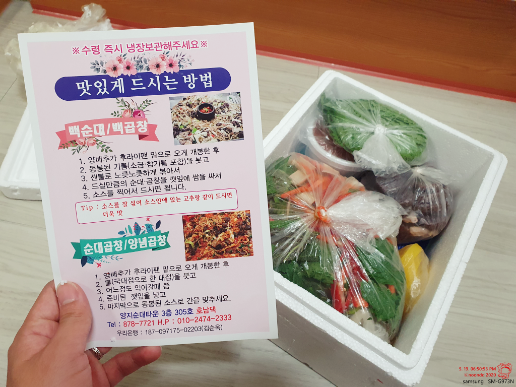 양지순대타운 3층 303호 호남댁. 신림동 백순대 배송 식당들이 여러 곳이 있는데, 그중 가장 깔끔해 보이고, 평이 좋은 곳을 고른 거라 하더라. 조리법이 자세히 설명되어 있어서 든든.