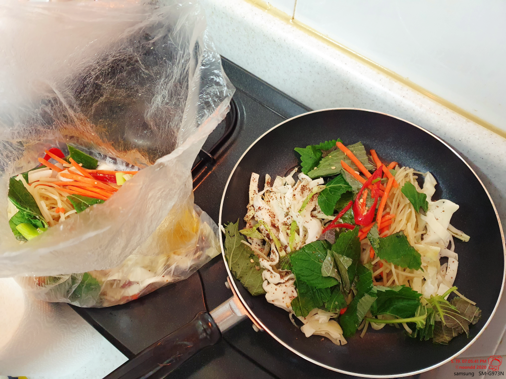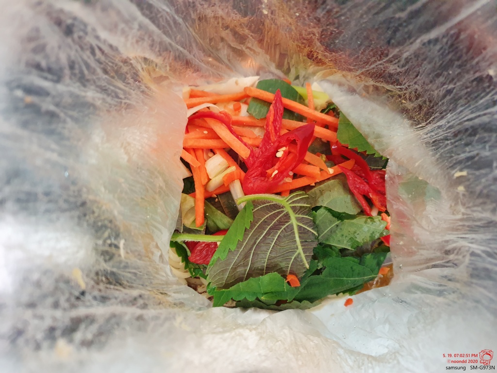 시키는 대로 양배추가 아래로 오게 해서 쫄면이랑 야채들을 올리고, 소금 참기름을 부어 줬다. 야채엔 이미 들깨가루가 묻어있다.