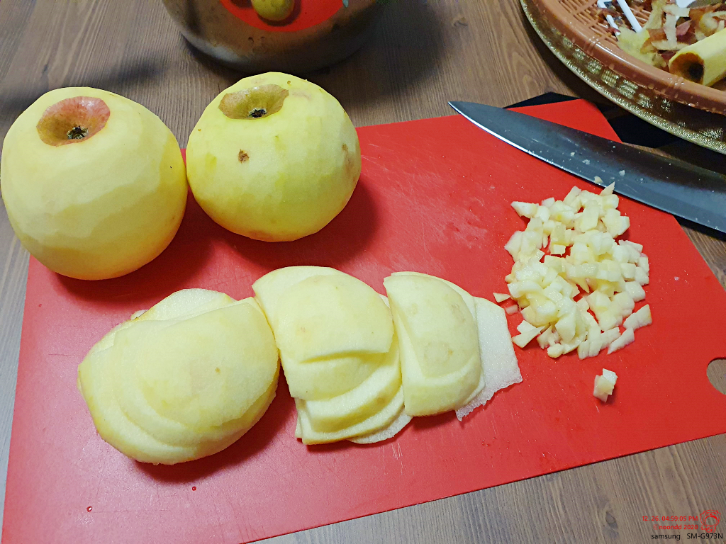 사과는 세 개가 있으니, 있는 거 몽땅 쓰기로 했다. 다행히 아직 물렁하진 않았다. 받고 방치한지 제법 오래됐었는데... 신기했다.