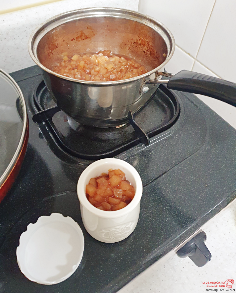 조그만 편수 냄비 한가득. 황설탕을 하라 했는데 없어서, 하얀 설탕을 넣고, 흑당 시럽을 추가해 보완해 보기로 했다.