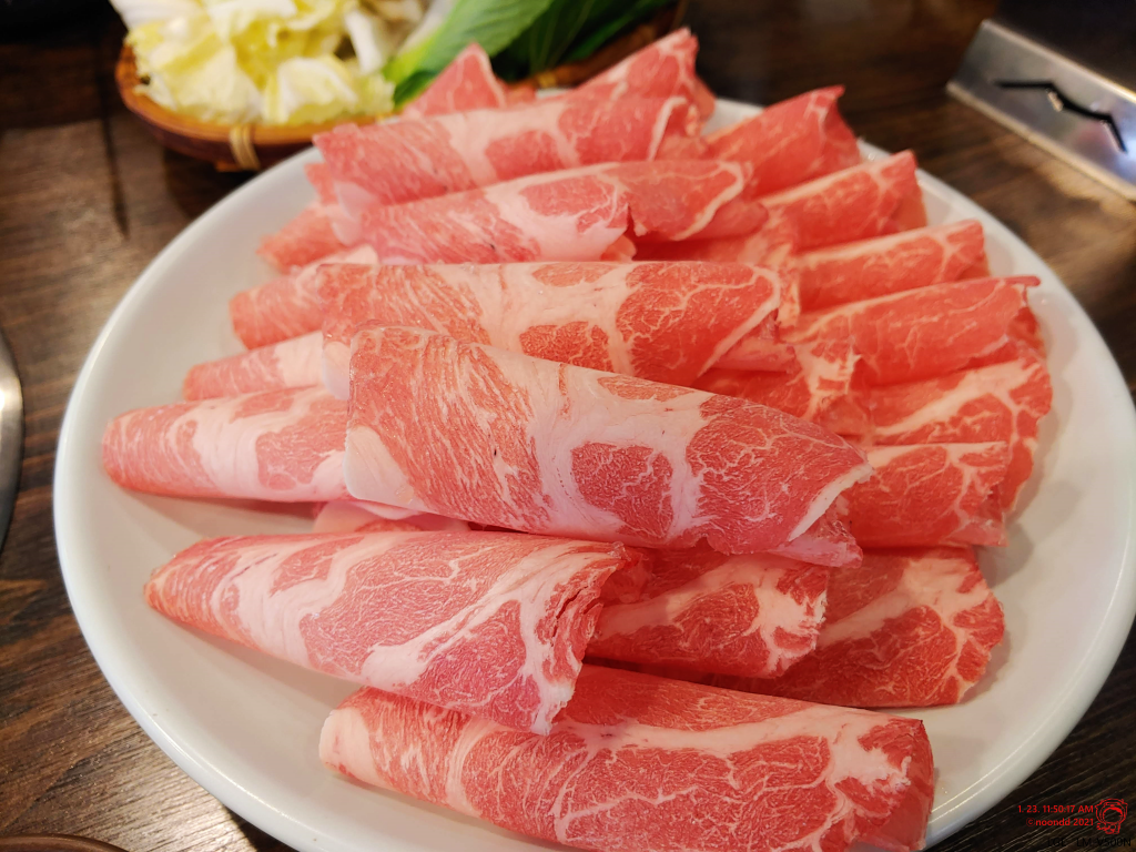 가격이 오르면서 고기 질이 더 좋아진 건지, 보다 기름지고 빛깔 좋은 모습이었다. 샤브샤브로 먹는 소고기의 경우 담백한 부위를 쓰는 탓인지 직관적으로 맛있다기보다는 '그냥 고기'라는 느낌으로 먹게 되는데, 돼지고기라 보다 고소하고 착착 붙는달까?