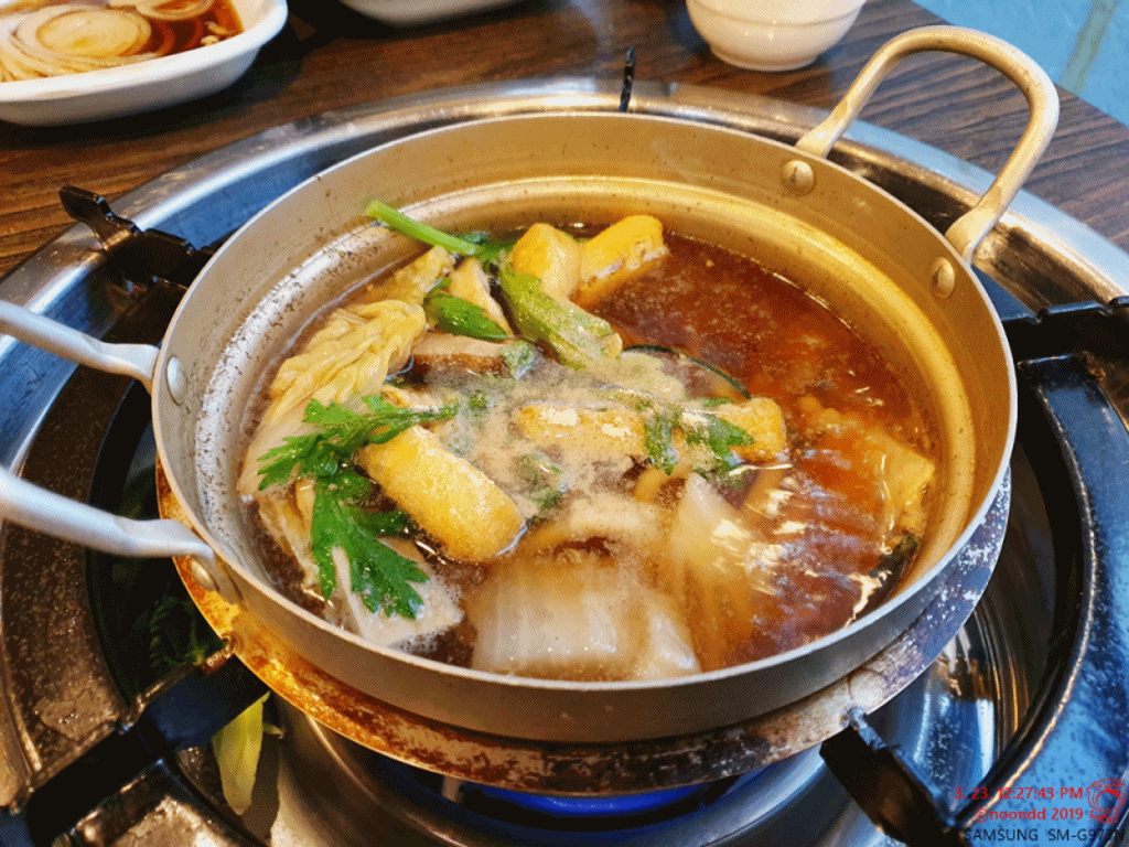 표고버섯과 다시마를 우린 육수가 깔끔한 맛을 낸다. 얇게 썬 소고기 등심, 각종 버섯, 채소를 고객이 직접 끓여 먹을 수 있다(우동 서비스).