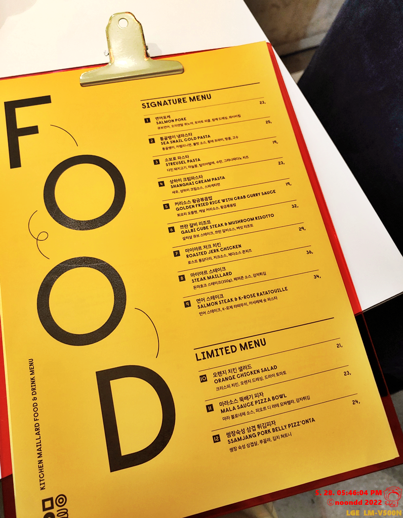 Kitchen Maillard 키친마이야르 - FOOD : SIGNATURE MENU 8 마이야르 스테이크 STEAK MAILLARD + LIMITED MENU 12 쌈장숙성 삼겹 튀김피자 SSAMJANG PORK BELLY PIZZ'ONTA/ DRINK : SIGNATURE DRINKS : 아이셔 하이볼 EXTREME SOUR HIGH BAL..
