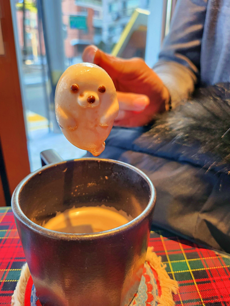 그래도 확실히 재밌긴 하다. 별첨인 하프물범 마시멜로는 흰 덩어리에 눈이랑 코가 점점점 찍혀 있는 디자인인데, 생산 공정이 세밀하진 않은지 엉뚱한 곳에 찍혀 있어서 애매하게 생긴 경우도 많더라. 인상이 더러워 보이는 경우도 있고, 억울하게 생긴 애도 있고... 은근 그것부터가 복불복 ㅎㅎ