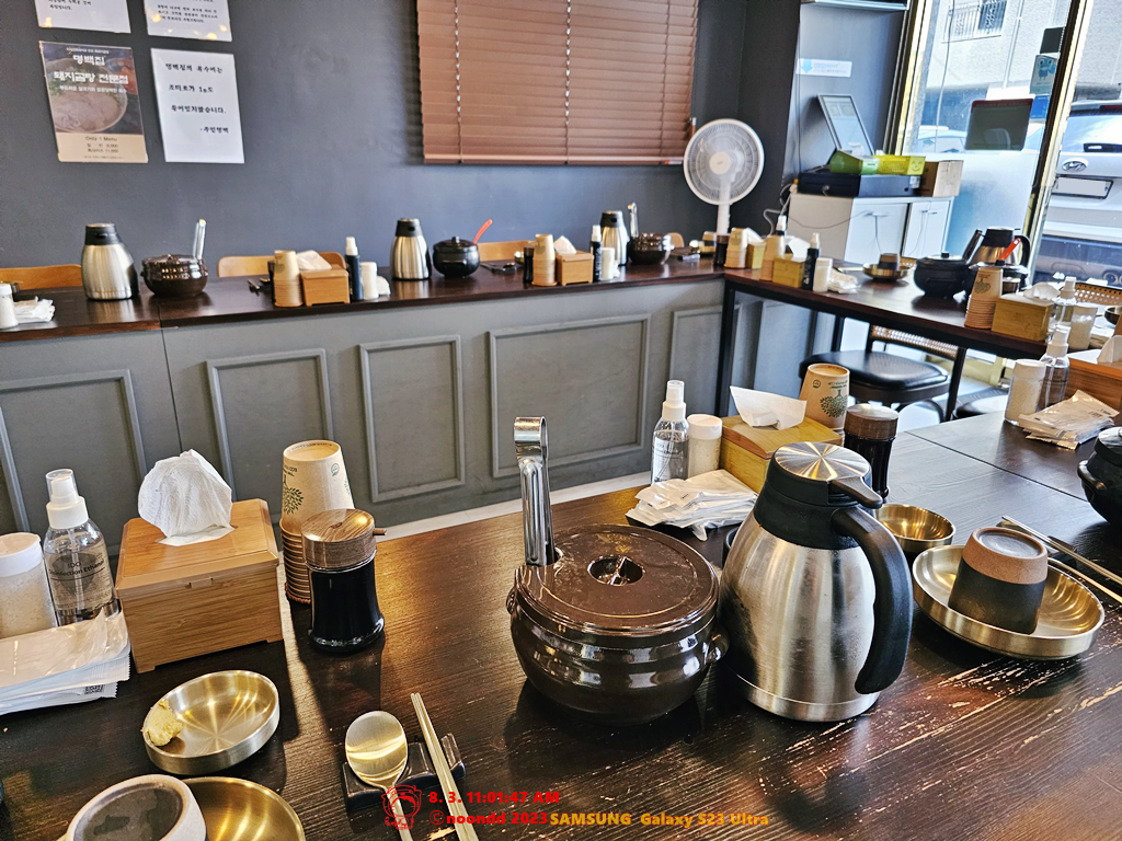 주전자 옆에 놓인 단지 모양의 플라스틱 통에는 김치가 들어 있는데, 한 통엔 깍두기, 다음 통엔 배추김치가 교차로 배치되어 있어 취향에 맞춰 골라 먹으면 된다.