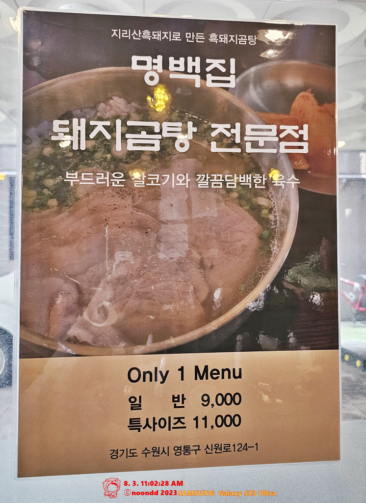 망포역 근처에 위치한 명백집. 구워 먹어도 맛있을 지리산 흑돼지로 곰탕을 만든단다. 원래 망포 쪽은 잘 안 가기도 하지만, 서너 시간밖에 되지 않는 영업시간도 방문을 망설이게 되는 요인 중 하나였다. 이것만 먹자고 갔는데 못 먹게 되면 대안이 마땅치 않을 것 같기도 하고. 그런데 최근에 마침 근처에서 볼 일이 생긴 김에 들러 봤는데, 가는 길이 생각보다 많이 오르막이었다. 땡볕 아래 뚜벅이에겐 다소 험난한 여정.