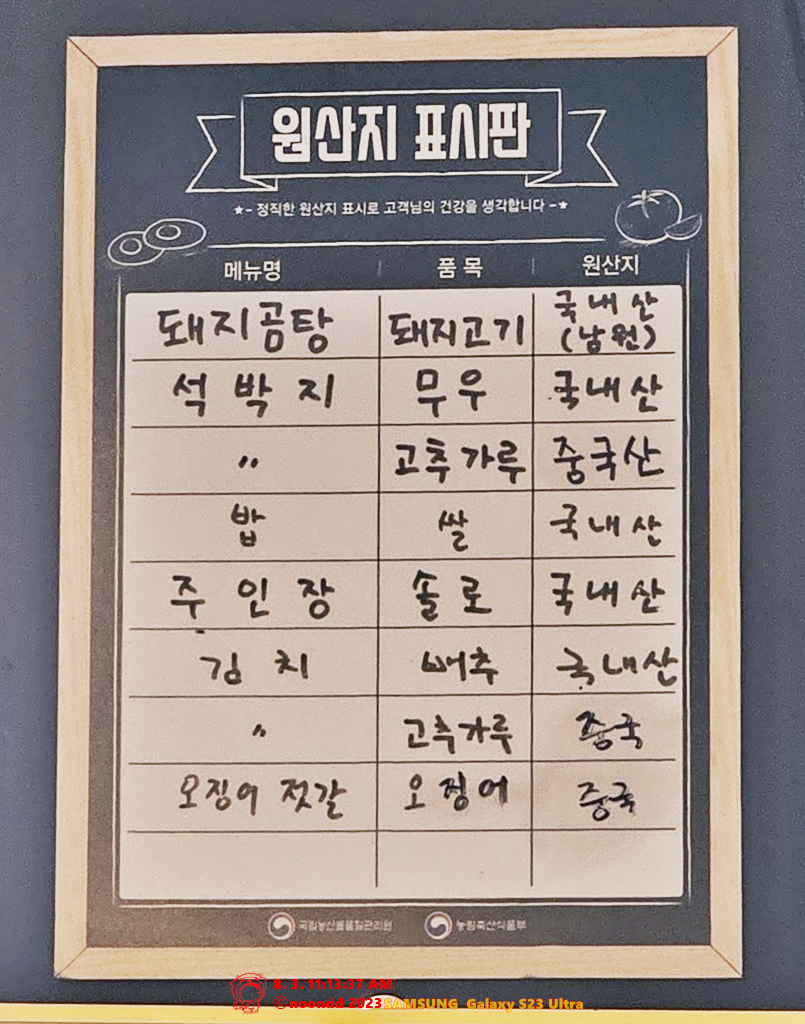 명백집에서 파는 메뉴는 오로지 돼지곰탕 하나뿐. 단일 메뉴를 파는 식당을 더러 보긴 했지만 음료나 술도 전혀 판매하지 않는 건 상당히 독특했다. 기다리면서 원산지 표시판도 살펴봤는데, 지리산 흑돼지라는 돼지고기는 남원에서 온 모양. 가장 눈길을 끄는 품목(?)은 "주인장 솔로 국내산"이었다. ㅋㅋ