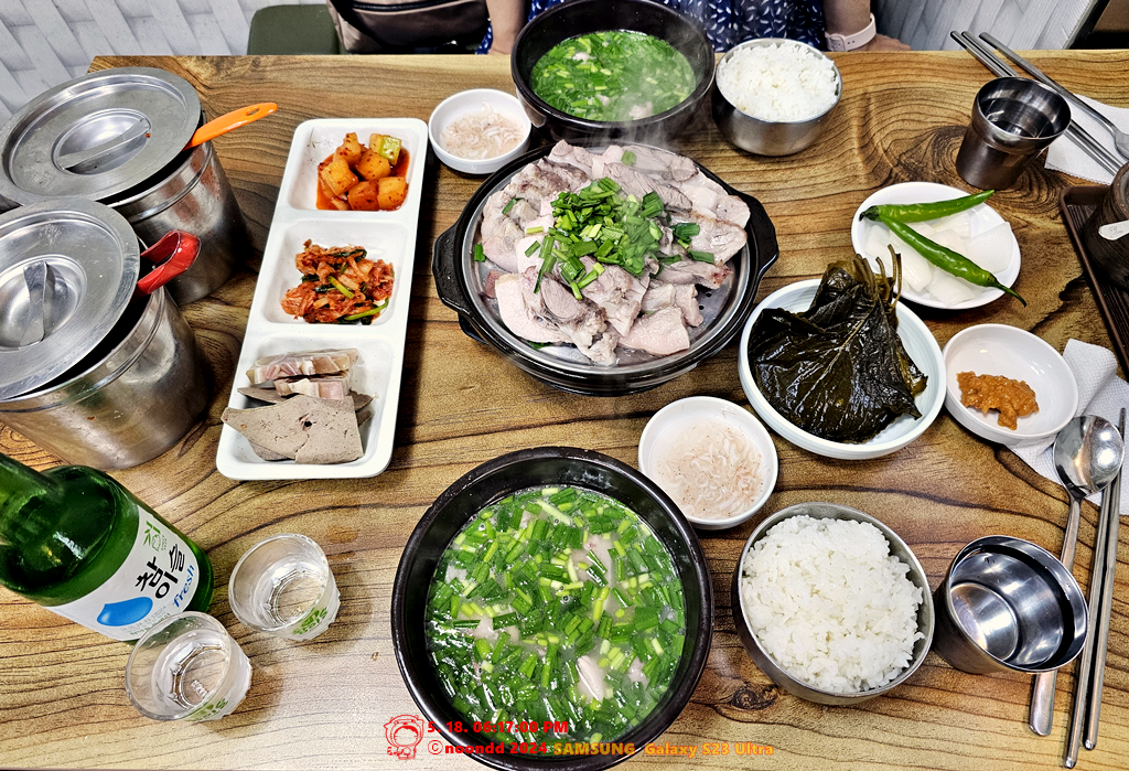 메뉴는 크게 돼지국밥과 순대국밥이 있지만, 이미 수육정식 비주얼에 꽂혀 있던 터라 주문엔 망설임이 없었다. 몰랐는데 우리 다음부터는 마감 시간이 얼마 남지 않아서 수육은 안 된다고 하시더라. 우리한텐 아무 언급도 없으셨는데, 바로 다음부터 안 된다고 하셔서 살짝 당황스럽긴 했다. 우리가 후딱 잘 먹어치우고 가버릴 것 같아 보이셨던 모양 ㅋㅋ