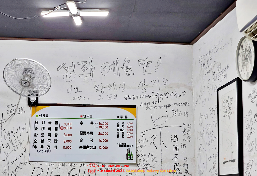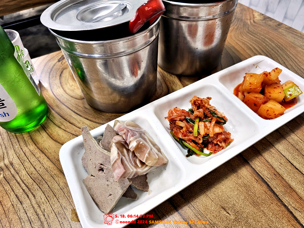 실은 카카오맵상에 합천돼지국밥은 토요일이 휴무라고 되어 있어서 하는 수 없이 여긴 다음을 기약하고 다른 식당들을 쭈욱 둘러보던 중이었다. 골목이 끝나갈 무렵 '여긴 어딘가?' 하며 봤는데, 여기가 거기라고? 게다가 장사하는데? 원래 1순위였으니 더 고민하지 않고 바로 들어갔다. 나중에 보니 네이버지도에는 7시에 닫는다고 되어 있었고, 실제로 매장 안 손님들한테는 6시 50분에 닫는다고 하셨다. 식사를 하는 도중 셔터가 드르르륵 내려왔고, 나와서 보니 오른쪽 사진처럼 "돼"만 보이더라.