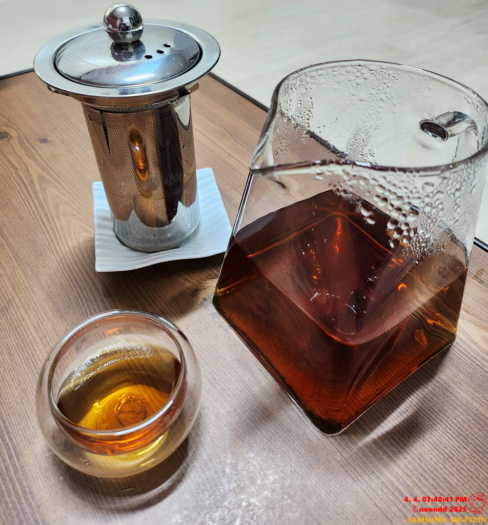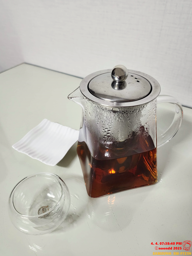 다이소 내열유리 티포트로 개시는 웨딩임페리얼로 해줬다. 바닐라에 우디하고 들큰한 게 딱 내 취향이라 좋아하는 홍차 중 하나. 추울 때 더 어울리긴 하지만, 차갑게 먹는 것도 은근 괜찮다. 차망 눈이 너무 촘촘해서 '괜히 막혀서 잘 안 우려 지지 않을까?' 싶었는데, 마지막 남은 찻잎을 탈탈 털었더니 자잘한 쪼가리가 많아 오히려 유용했다. 딱히 막힐 기미도 보이지 않았다. (゜∇^d)!! 다만 차망과 티포트 받침이 필요햇. ヾ(゚д゚ )三( ゚д゚)ノ" 주방을 적당히 뒤져서 차망은 종지를 찾아다 그 위에 올렸고, 사진엔 없지만 티포트는 코르크 재질의 컵받침으로 받쳤다. 덕분에 더블월 스타일 쁘띠 찻잔도 개시. 2개 세트였던 걸로 기억하는데, 하난 어디 간 거지? 여튼 더 맛있는 것 같은 느낌적인 느낌 (o^-')b ! 아깝지 않은 소비였다. 헿
