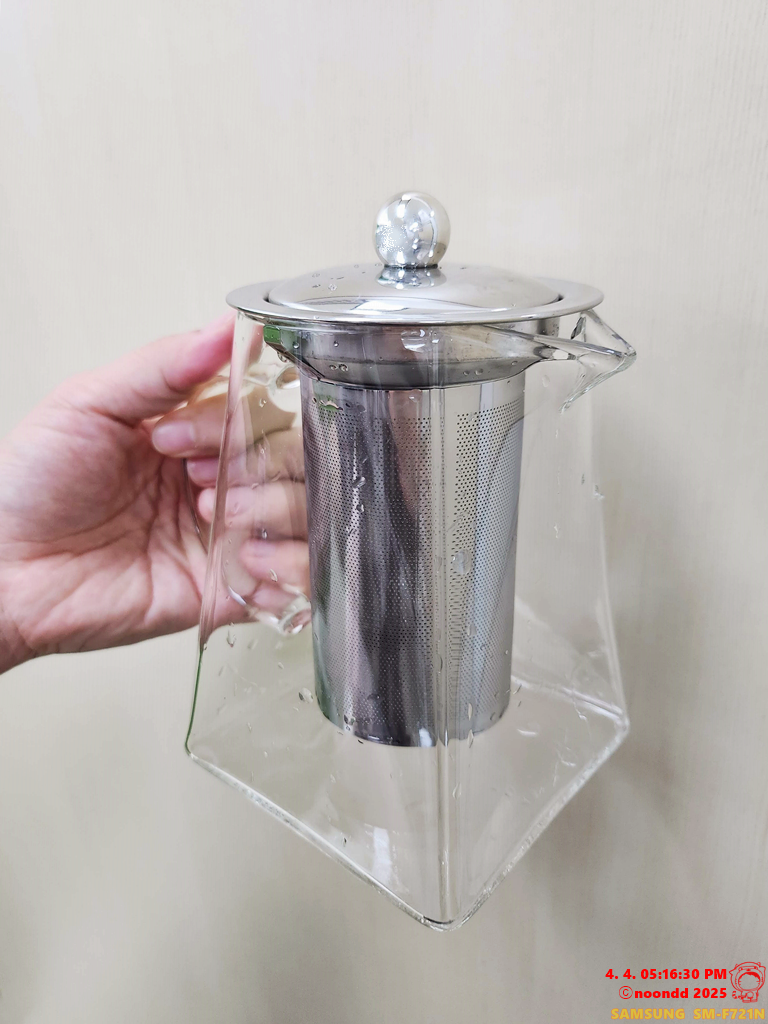 비닐을 벗기고, 바닥에 붙은 스티커도 벅벅 떼어 내고 나니 제법 그럴싸한 모양새다. 뚜껑은 꽉 닫히는 게 아니고 스윽 얹는 느낌이라 안에 담긴 액체를 컵에 따를 땐 한 손으로 손잡이를 잡고 사용해야 쏟아지지 않는다. 해서 양손으로 손잡이를 잡고 따라야 함. (っ´▽`)っ 오른손은 유리 손잡이, 왼손은 스테인리스 동글이 손잡이! 또 맨손으로 차망을 씻을 땐 다칠 수 있으니 조심하란 안내 문구가 있었는데, 진짜 베일 수도 ( ゚ェ゚)