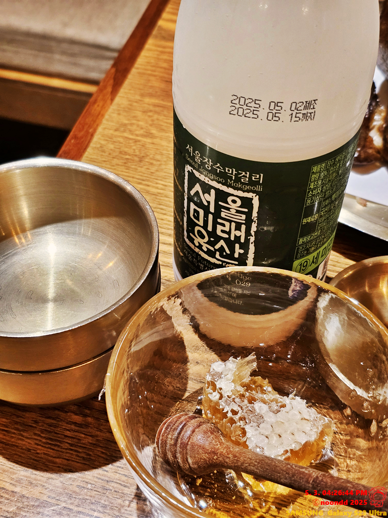 메뉴판 사진엔 양은주전자와 누런 사발이 보였지만, 그냥 플라스틱 병채 나온 계류관 막걸리. 동동주 같은 거려나 했는데 그냥 장수막걸리였다. 이럴 거면 호랑이 막걸리 먹었지. 식당 기준 장수막걸리의 적정가는 5천 원이란 점과 동일 가격에 더 맛있는 대체제가 있는 상황이라 알았다면 안 먹었을 게다. 주전자가 안 나온 건 직원 실수라고 했는데, 어차피 달라질 건 없어서 걍 먹었다. 벌꿀이 추천이라기에 주문해 봤는데 영 안 어울린다. 완전 비추. 그냥 대대포 골드나 마셔볼걸. ( 。゚Д゚。)