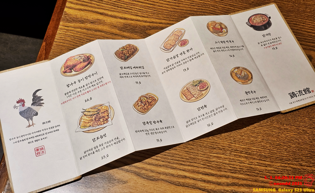 닭모듬전 당시 21,000원, 현재 25,000원. 고기된장막국수 당시 10,000원, 현재 12,000원. 막국수의 면은 직접 제면하고 있으며 최적의 풍미를 위해 제주산 쓴메밀과 일반 메밀을 블렌딩 하여 자가 제면한 면에 닭고기와 버터를 넣고 오랜 시간 볶은 된장 양념을 곁들였습니다.